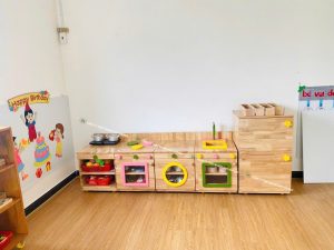 Tủ kệ bếp mầm non gỗ cao su sơn 2k